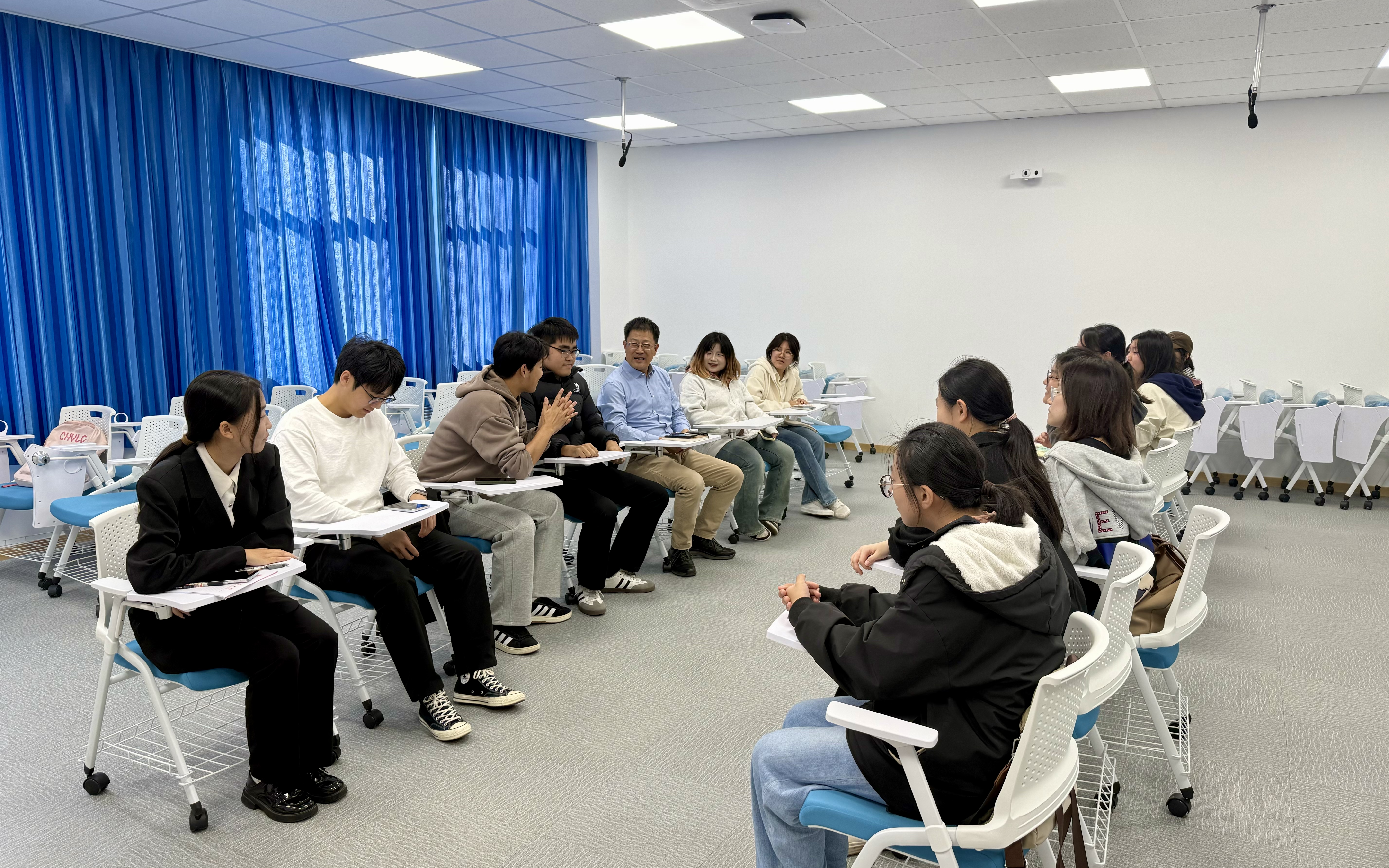 院长王灏与英语242班学生围绕学业发展、生涯规划等内容进行了深入而广泛的座谈交流。