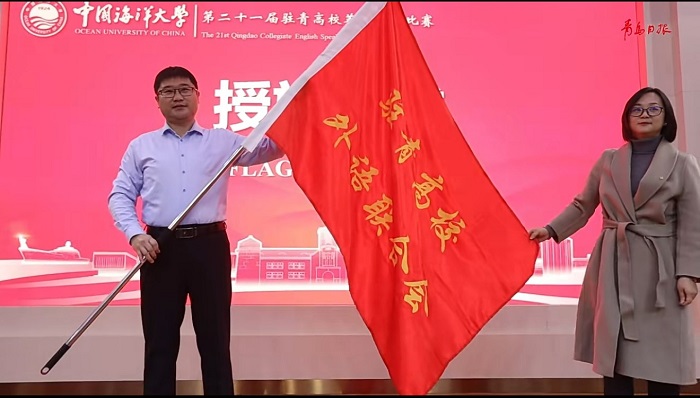 党委副书记兼副院长戴淑妮手中接过比赛旗帜,第二十二届驻青高校演讲比赛将由青岛科技大学承办,为校际外语交流合作续写新的篇章。