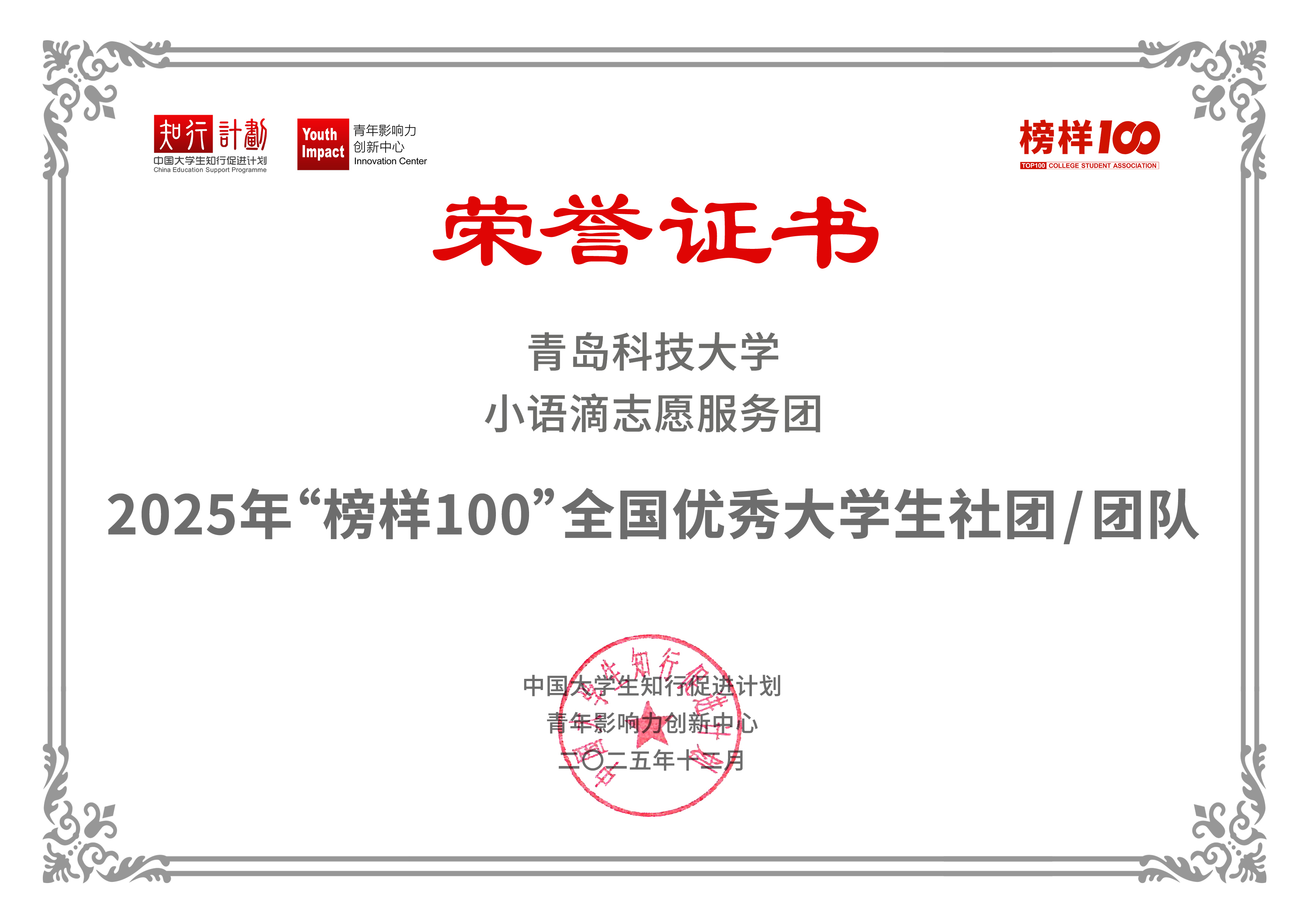 近日,2025年“榜样100”全国优秀大学生社团及团队(第二批)榜单正式发布。该榜单由中国大学生知行促进计划与青年影响力创新中心联合发布,全国共有376所高校的1320支团队参与申报。我院“小语滴”志愿服务团凭借扎实的服务成效和突出的社会影响力,在激烈竞争中脱颖而出,展现出我院青年志愿服务的卓越风采。