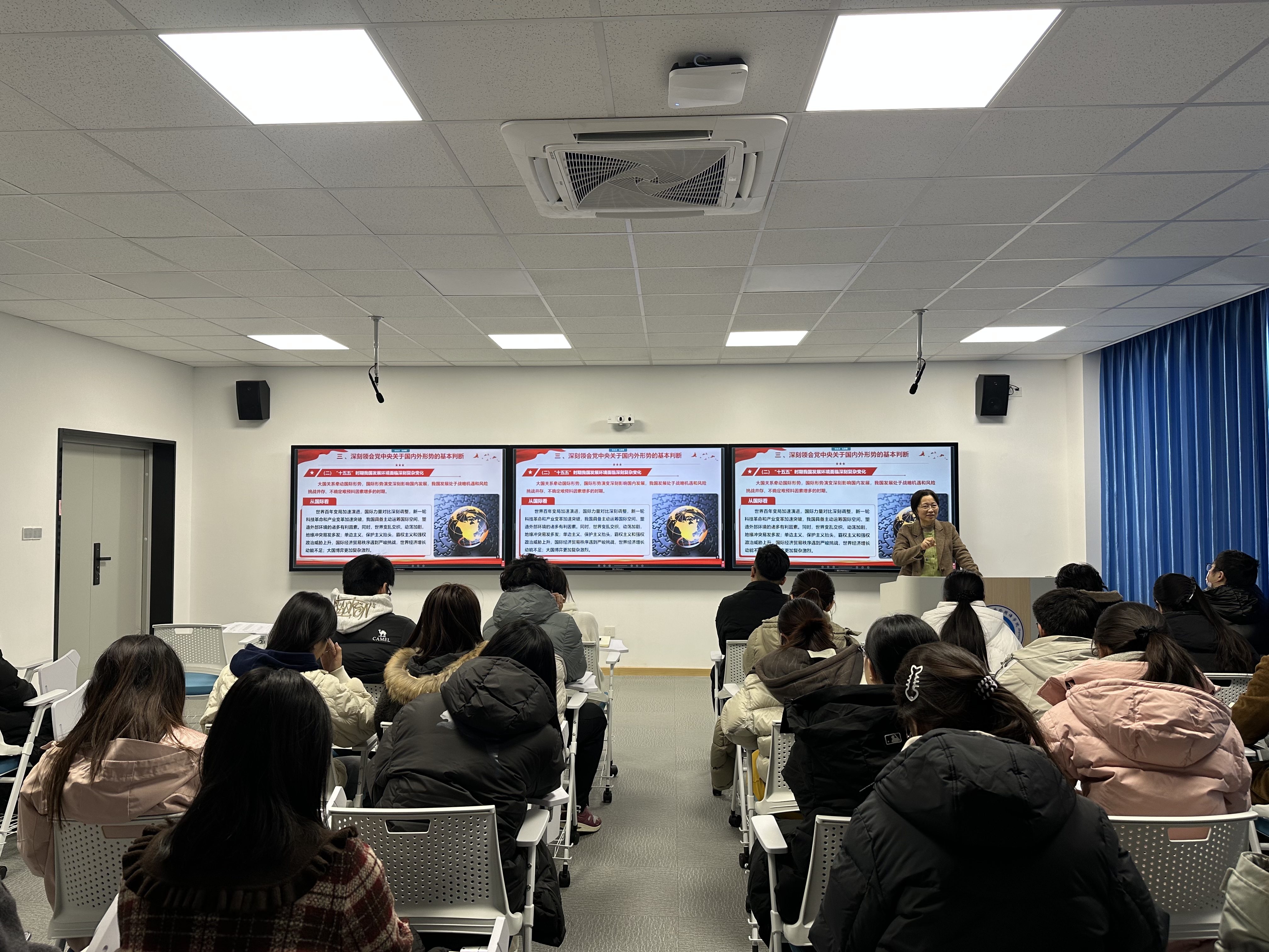 党委书记曲斌艳在智慧教室412为学生党员、入党积极分子及团学干部讲授专题党课。