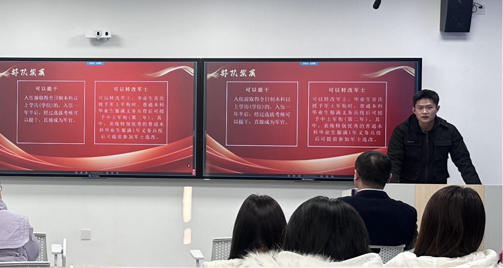 征兵入伍专题,俄语221班牛庆伟结合部队经历,围绕征兵政策解读和资助政策等内容,向学生骨干传递了投身国防、报效祖国的青春号召,并帮助大家全面了解资助政策和资助流程相关事宜。
