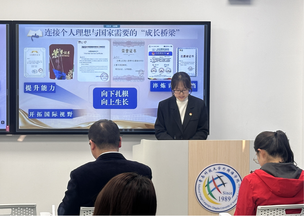 志愿服务代表日语221张丹忆,入选学校第28届研究生支教团,她结合自身志愿服务经历,讲述学生骨干如何在志愿服务中迅速成长,倡导学生骨干积极践行奉献精神,带动更多同学投身公益实践。